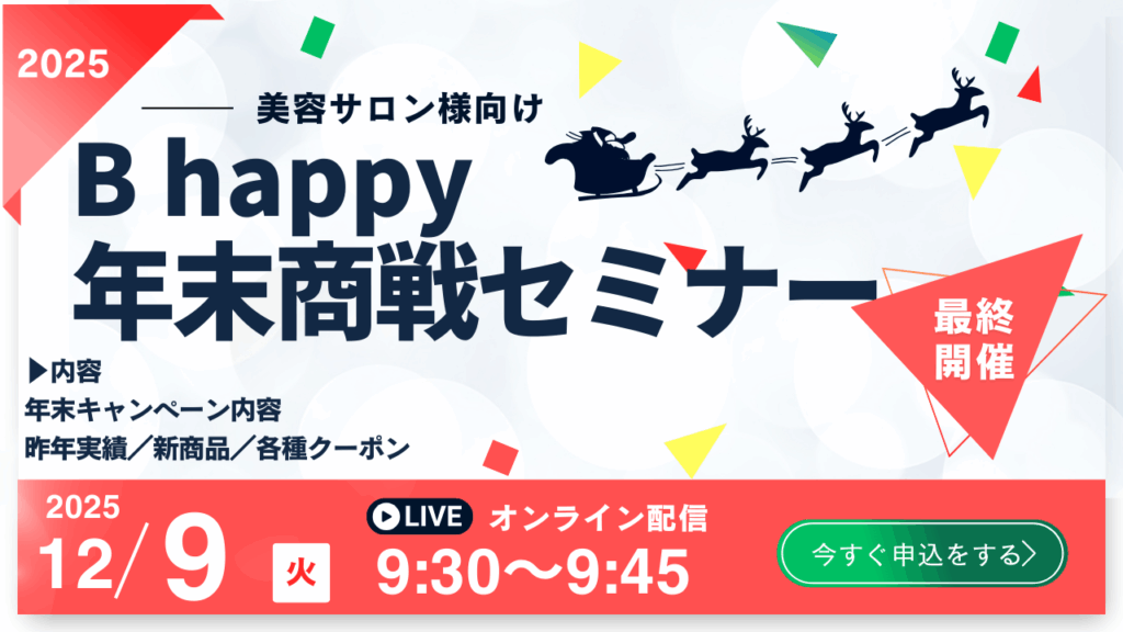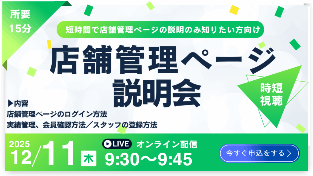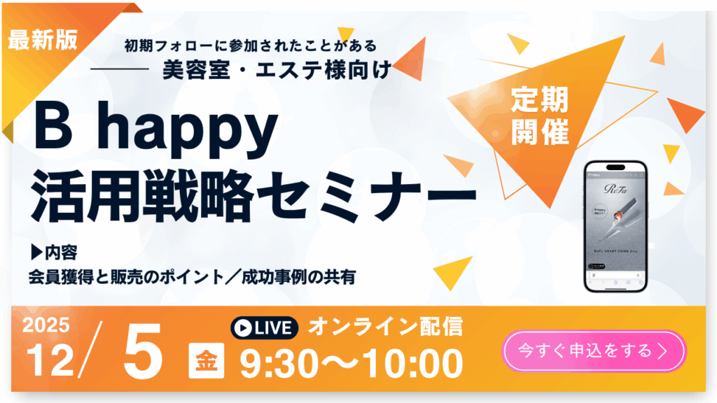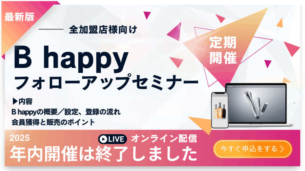 ONLINE SEMINAR 視聴方法について 視聴URLはセミナーの1週間前、前日、当日にお申込みのメールアドレス宛にお送りいたします。※Zoomアプリをインストール後、届いたURLよりご入室ください。入室の際にウェビナー登録をするとご参加いただけるようになります。また、視聴がスムーズに行えるよう、開催時間の10分前からURLへの接続をお願いいたします。ご不明な点がございましたら、担当営業までお気軽にお問い合わせください。皆様のご参加を心よりお待ちしております。 オンラインセミナー ※顔出し不要で参加可能です 【セミナー時間】約30分既に初期フォローを受けB happyに取り組んで頂いている方向けにB happy活用のポイント・成功事例の共有をいたします 【セミナー時間】約30分既に初期フォローを受けB happyを店舗で取り組んで頂いている方向けに活用のポイント・成功事例の共有をいたします 【セミナー時間】約15分収益確認方法やスタッフ登録方法など店舗アカウントの説明に特化したセミナーですB happyは既に運用しているけれど管理ページにログインしたことない方は是非お申込みください 【セミナー時間】約30分年末商戦に向けたB happyの特別企画のご紹介や昨年の年末実績を含めた年末の活用方法をご案内いたします 【セミナー時間】約30分年末商戦に向けたB happyの特別企画のご紹介や昨年の年末実績を含めた年末の活用方法をご案内いたします 【セミナー時間】約30分B happy初期フォローに参加済みで復習したい方B happyについて基礎から知りたい方向けのセミナーです 【セミナー時間】約30分B happy初期フォローに参加済みで復習したい方B happyについて基礎から知りたい方向けの初心者セミナーです